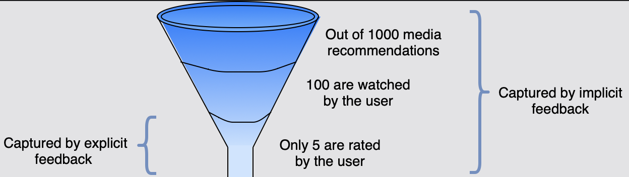 암시적 피드백은 사용자와 권장 미디어의 상호 작용에서 추출된다. 대부분의 경우 본질적으로 바이너리(binary)이다.