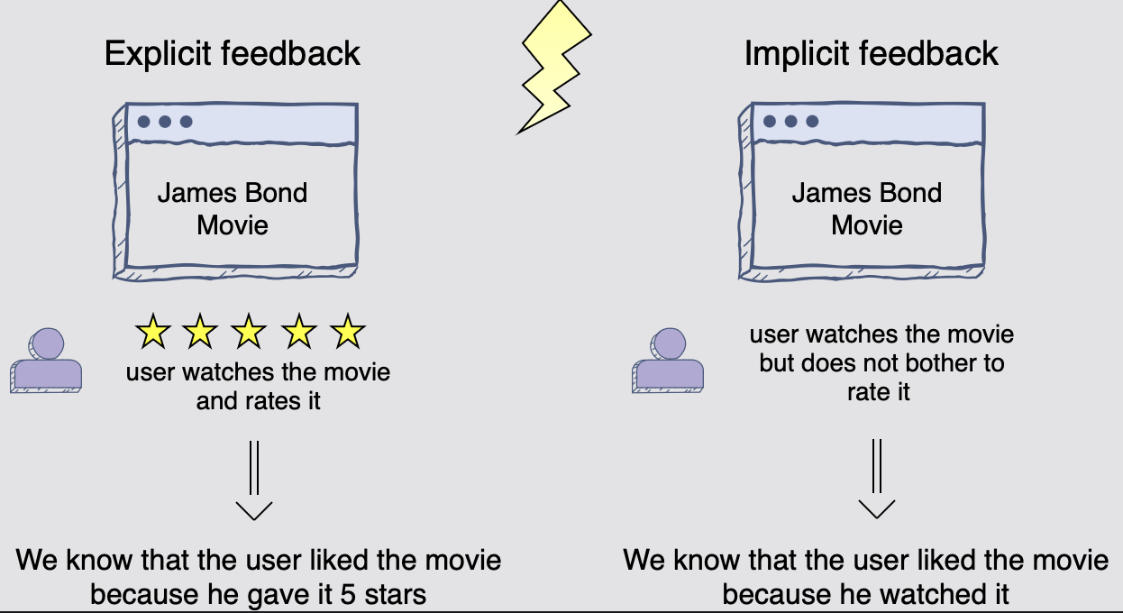 영화 등급을 예측하기 위해 "명시적 피드백(Explicit feedback)"을 사용하는 대신 "암시적 피드백(Implicit feedback)"을 확률 예측자로 사용하여 영화 순위를 결정한 이유를 살펴본다.