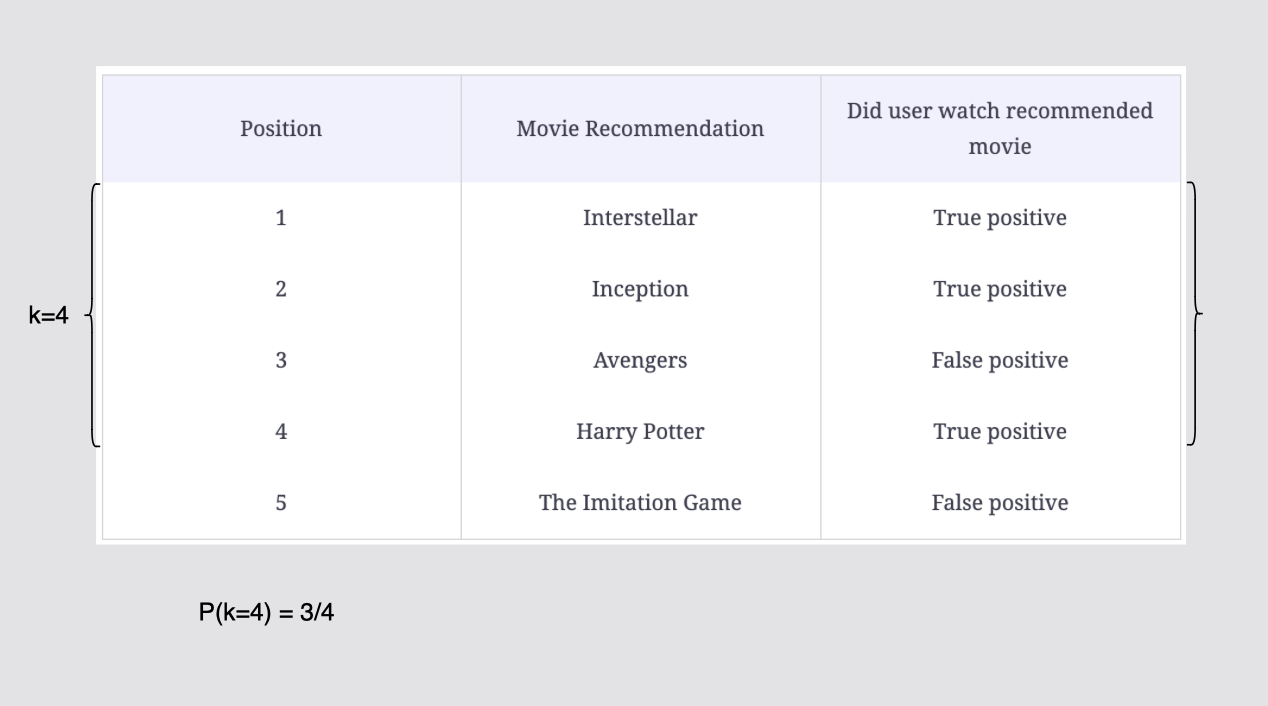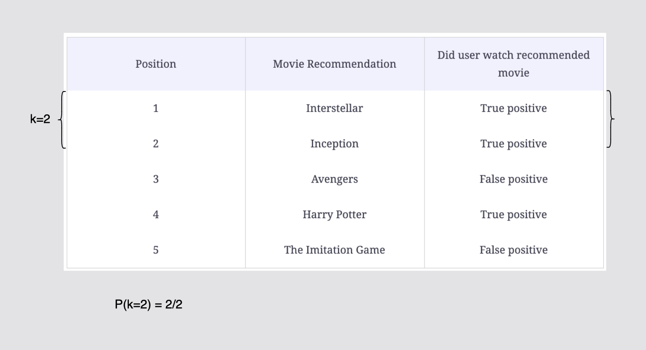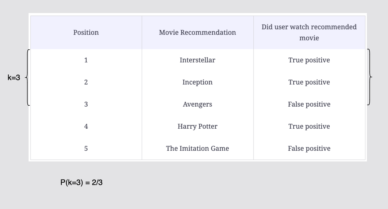 추천 목록 10개에서 k=2 위치에서 양성 예제의 비율은 r(k=2) = 2/10이다.