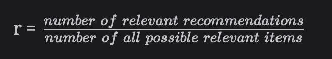 추천 목록에 대한 재현율은 목록의 관련 추천 수와 가능한 모든 관련 항목(쇼/영화) 수 간의 비율이다. 다음과 같이 계산할 수 있다.
