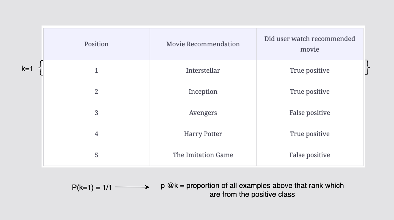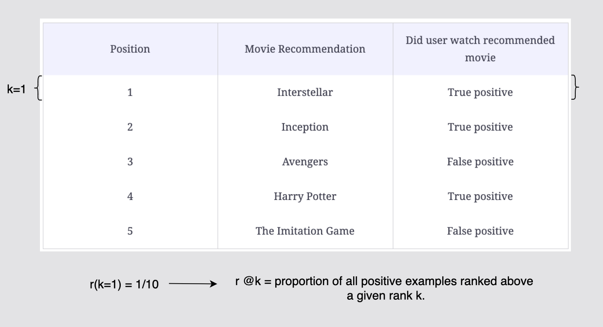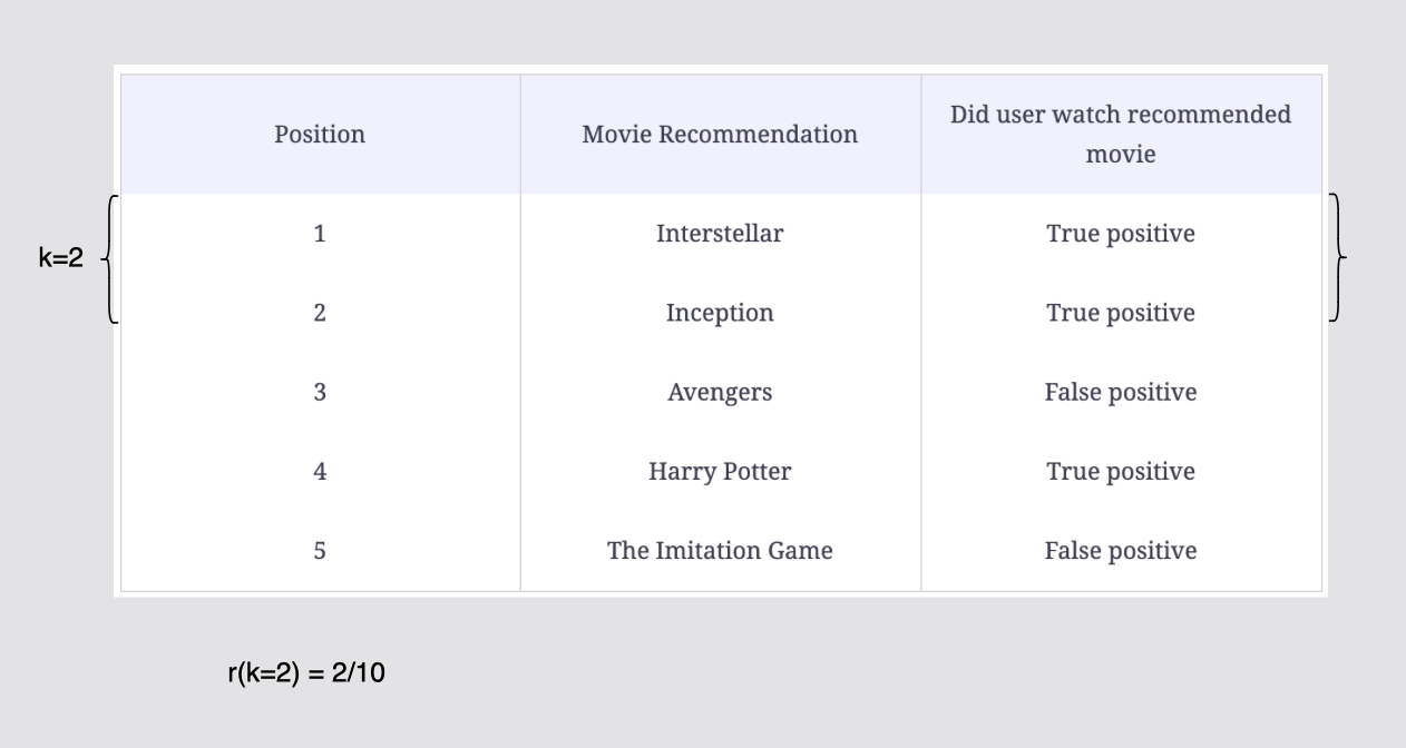r @ k 는 주어진 순위 k 보다 높게 순위가 매겨진 모든 양성(positive) 예제의 비율이다. 추천 목록 10개에서 k=1 위치에서의 양성 예제의 비율은 r(k=1) = 1/10이다.