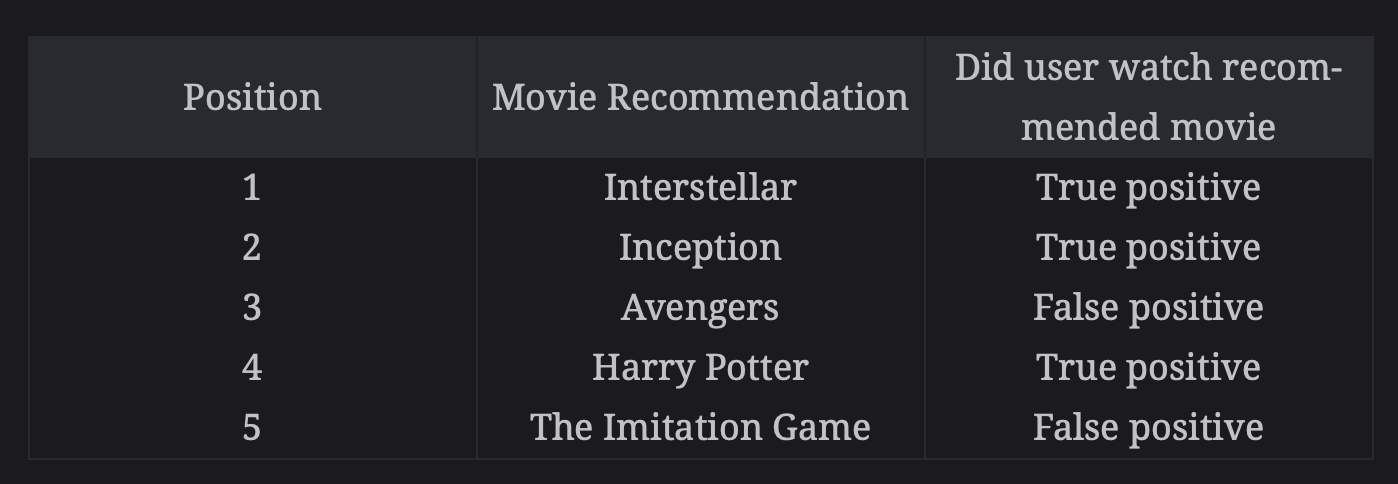 사용자 추천 목록에 있어야 한다고 자신있게 말할 수 있는 영화/시리즈 세트가 있으면 다음 오프라인 측정항목을 사용하여 추천 시스템의 품질을 측정할 수 있다.