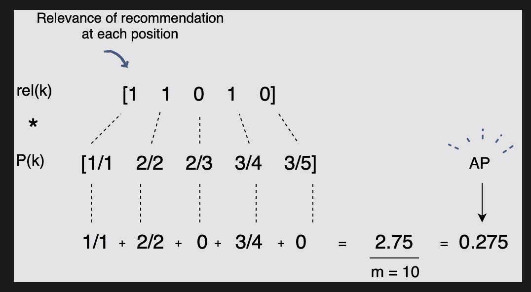 이 둘을 곱해주고, 총 추천됐던 10개의 추천으로 나눠주면 평균 정밀도 AP가 나오게 된다.