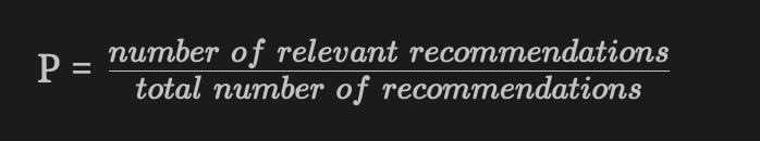 정밀도는 영화 추천 목록의 관련 추천과 전체 추천 간의 비율을 측정하는 것이다.