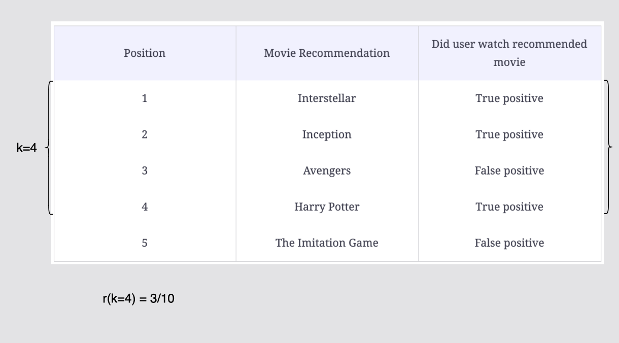 추천목록 10개 중 k=4에서의 재현율은 r(k=4) = 3/10이다.