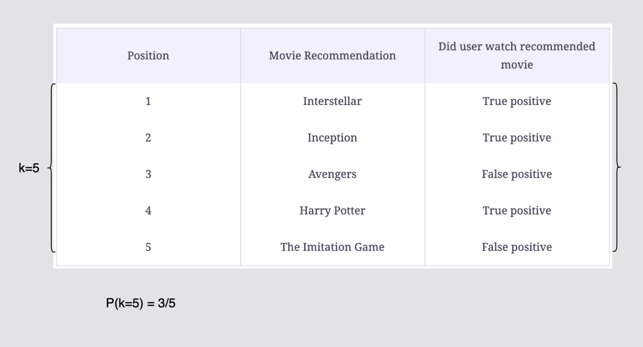 다음 다이어그램에서는 1부터 5까지 각 위치 k까지 추천 하위 집합의 정밀도를 계산한다.