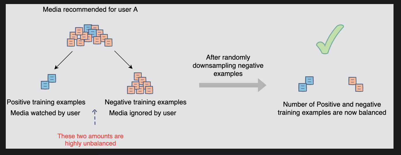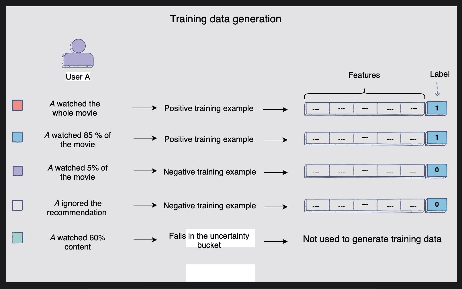 사용자 행동을 긍정적이고 부정적인 훈련 사례로 해석하는 한 가지 방법은 사용자가 특정 쇼/영화를 시청한 기간을 기반으로 한다. 사용자가 추천한 영화나 쇼를 대부분 시청한 경우, 즉 80% 이상 시청한 경우를 긍정적인 예로 들 수 있다.
