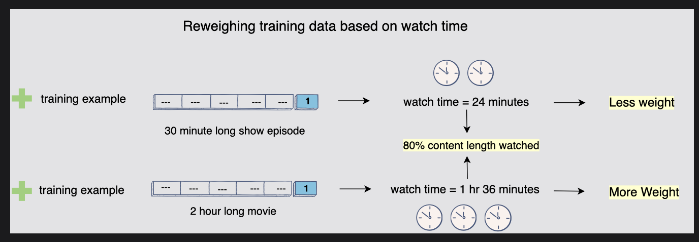세션 시청 시간에 대한 기여도가 더 높은 예시에 더 집중하도록 모델을 장려하는 한 가지 방법은 세션 시간에 대한 기여도를 기준으로 예시에 가중치를 부여하는 것이다.