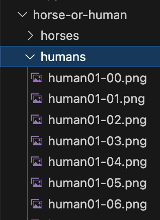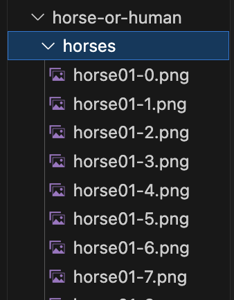 추후 받은 알집 파일을 압축 해제 한다. horse-or-human 디렉토리가 생기는데 horse-or-human 디렉토리 안에 horse, human 디렉토리가 생기고 해당 디렉토리안에 파일들이 저장되어 있다.