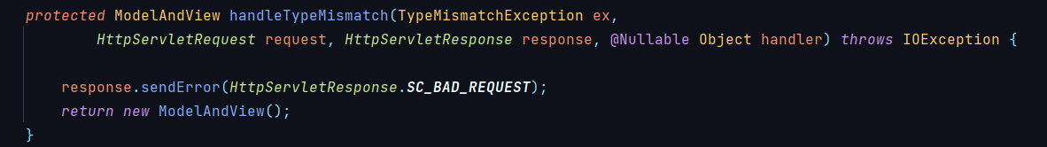 DefaultHandlerExceptionResolver.handleTypeMismatch 를 보면 아래 코드를 확인할 수 있다. 결국 response.sendError( ) 를 통해 문제를 해결한다.