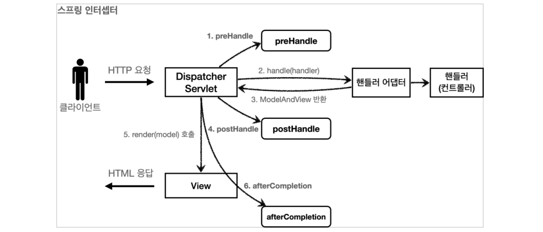 인터셉터 : 컨트롤러 호출 전 (preHandle) , 호출 후 (postHandle) , 요청 완료 이후 (afterCompletion) 와 같이 단계적으로 세분화