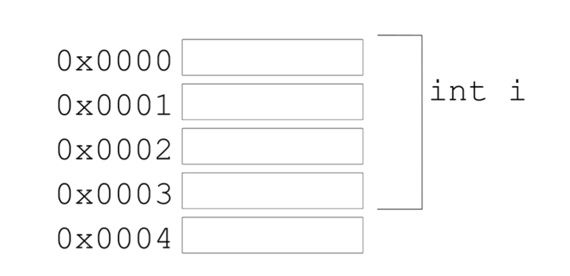 이렇게 예약한 메모리 영역인 0x0000, 0x0001.. 등의 주소가 가리키는 영역에 int i라는 변수가 들어가게 된다. 변수의 메모리 주소는 변수가 사용하는 메모리 주소의 첫번째를 가리킨다.