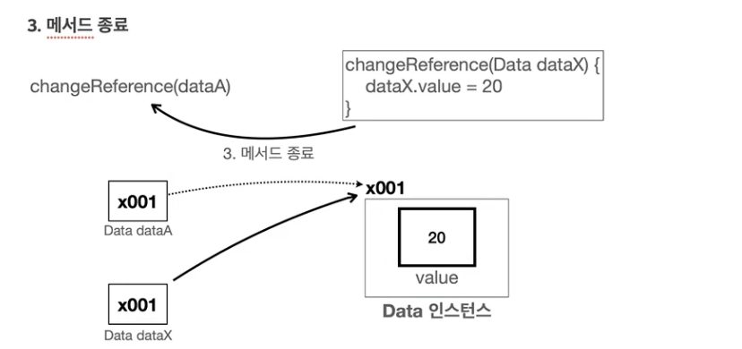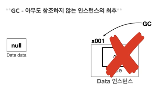 마지막에 data에 null을 할당했다. 아무도 참조하지 않으면 x001이라는 참조값에 다시 접근할 방법이 없다. 이렇게 아무도 참조하지 않는 인스턴스는 사용되지 않고 메모리 용량만 차지한다. 자바는 이런 과정을 자동으로 처리한다. 아무도 참조하지 않는 인스턴스가 있으면 JVM의 GC가 더이상 사용하지 않는 인스턴스라 판단하고 해당 인스턴스를 자동으로 메모리에서 제거해준다.**