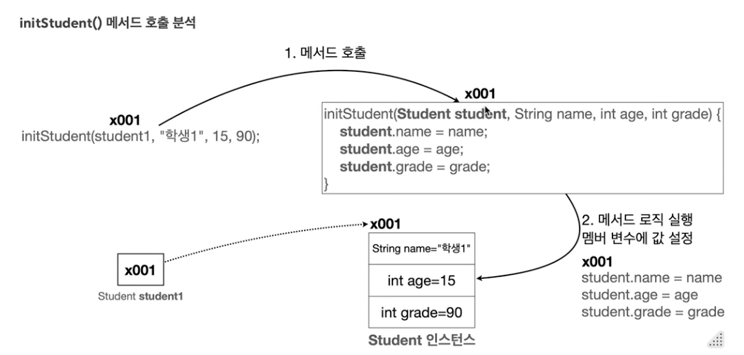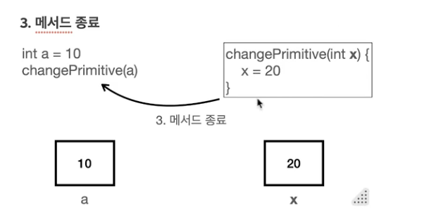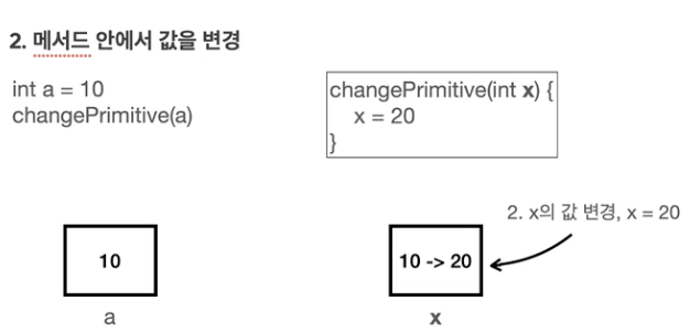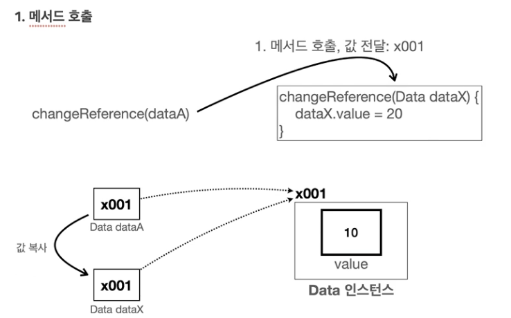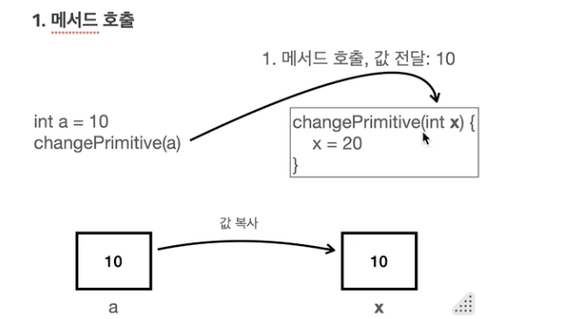 메서드 호출도 마찬가지다. 메서드를 호출할 때 사용하는 매개변수(파라미터)도 결국 변수일 뿐이다. 따라서 메서드를 호출할 때 매겨변수에 값을 전달하는 것도 앞서 설명한 내용과 같이 값을 복사해서 전달한다.
