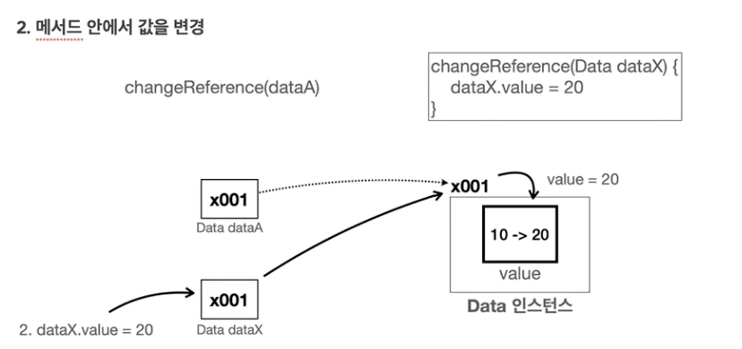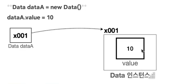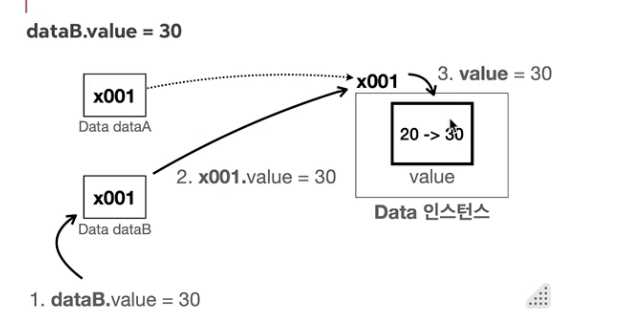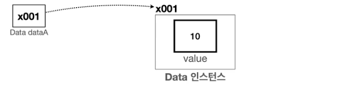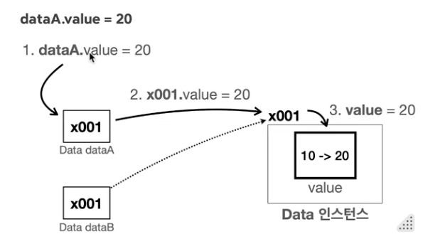 변수의 대입은 변수에 들어있는 값을 복사해서 대입한다. dataA가 가리키는 인스턴스를 복사하는 것이 아니라, 변수에 들어있는 참조값만 복사해서 전달한다.