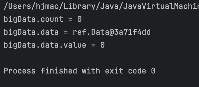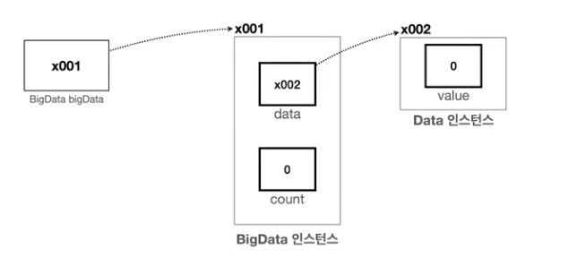 BigData를 생성하면 그의 인스턴스가 생성되는데, BigData의 data 멤버변수는 참조형이므로 null로 초기화 된다. count는 숫자이므로 0으로 초기화된다.