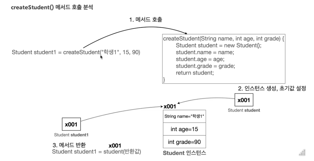 createStudent()는 생성한 Student 인스턴스의 참조값을 반환한다. 이렇게 반환된 참조값을 student1 변수에 저장했다. student1을 통해 Student 인스턴스를 사용할 수 있다.