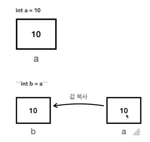 자바에서 변수에 값을 대입하는 것은 변수에 들어있는 값을 복사해서 대입하는 것이다.(기본형, 참조형 모두)