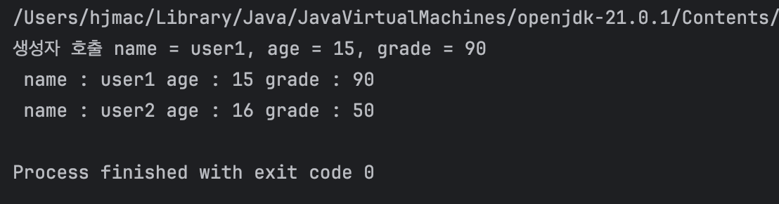 System.out.println("생성자 호출 name = " + name + ", age = " + age + ", grade = " + grade);