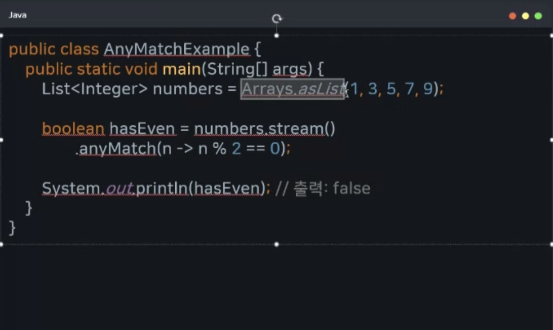 - 스트림 요소 중 하나라도 조건을 만족하는지 검
