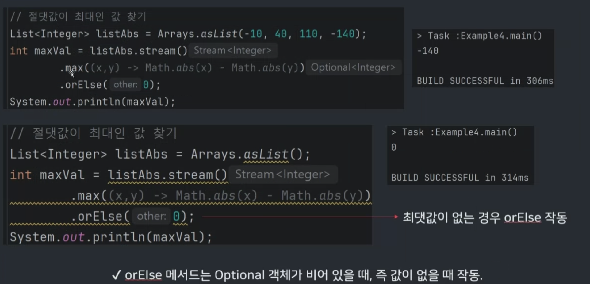 - 스트림 API의 최종연산은 Optional을 반환할 수 있고 그렇지 않을 수도 있음