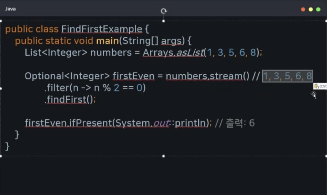 - 스트림에서 생성된 요소 중 첫 번째 요소를 반환