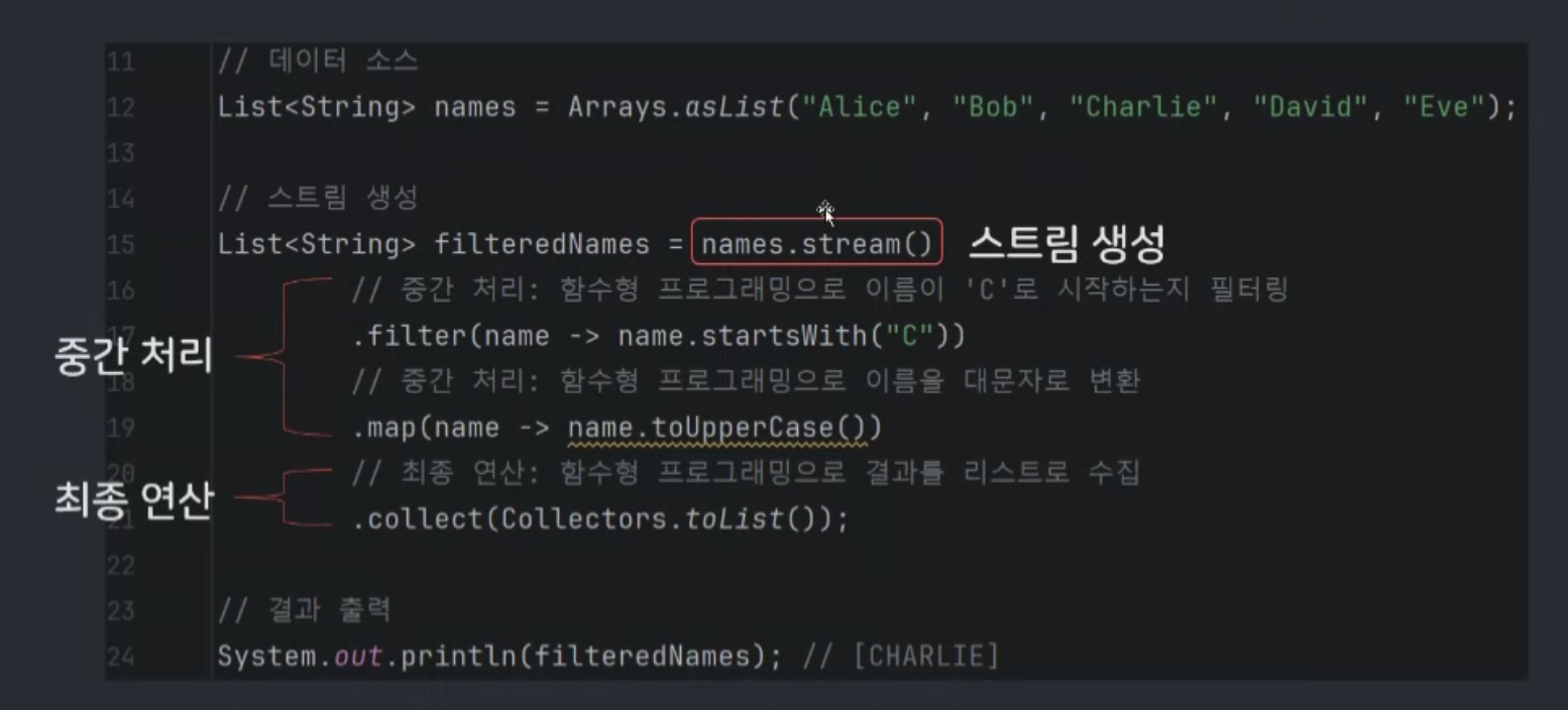 - 배열, 리스트, 집합 등 다양한 데이터에 동일한 데이터 처리 적용 가능