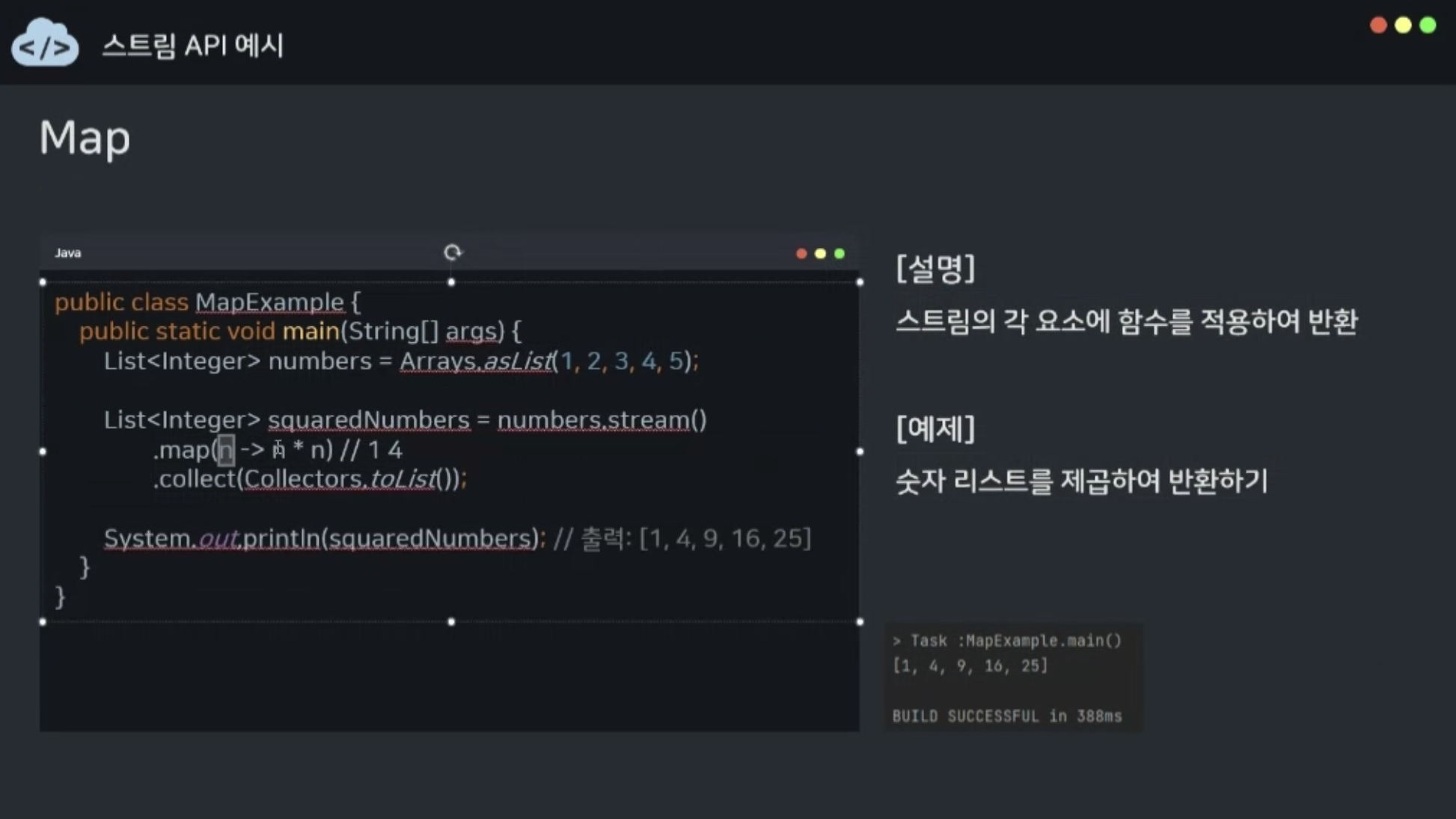 - 스트림의 각 요소에 함수를 적용하여 반환