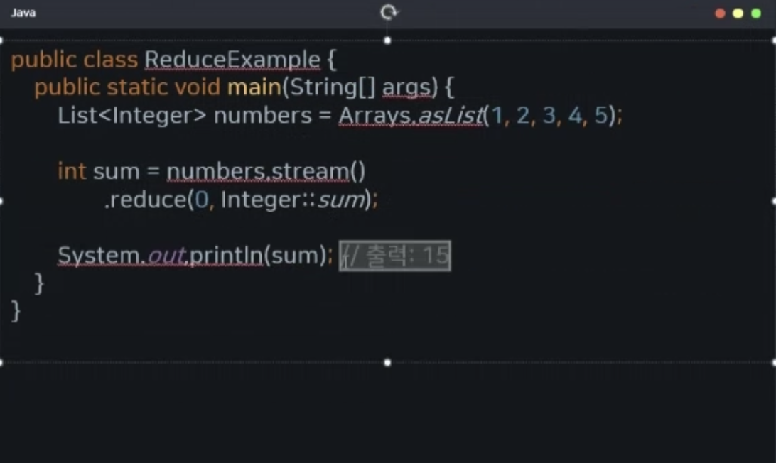 - 스트림의 요소를 결합하여 하나의 값으로 반환