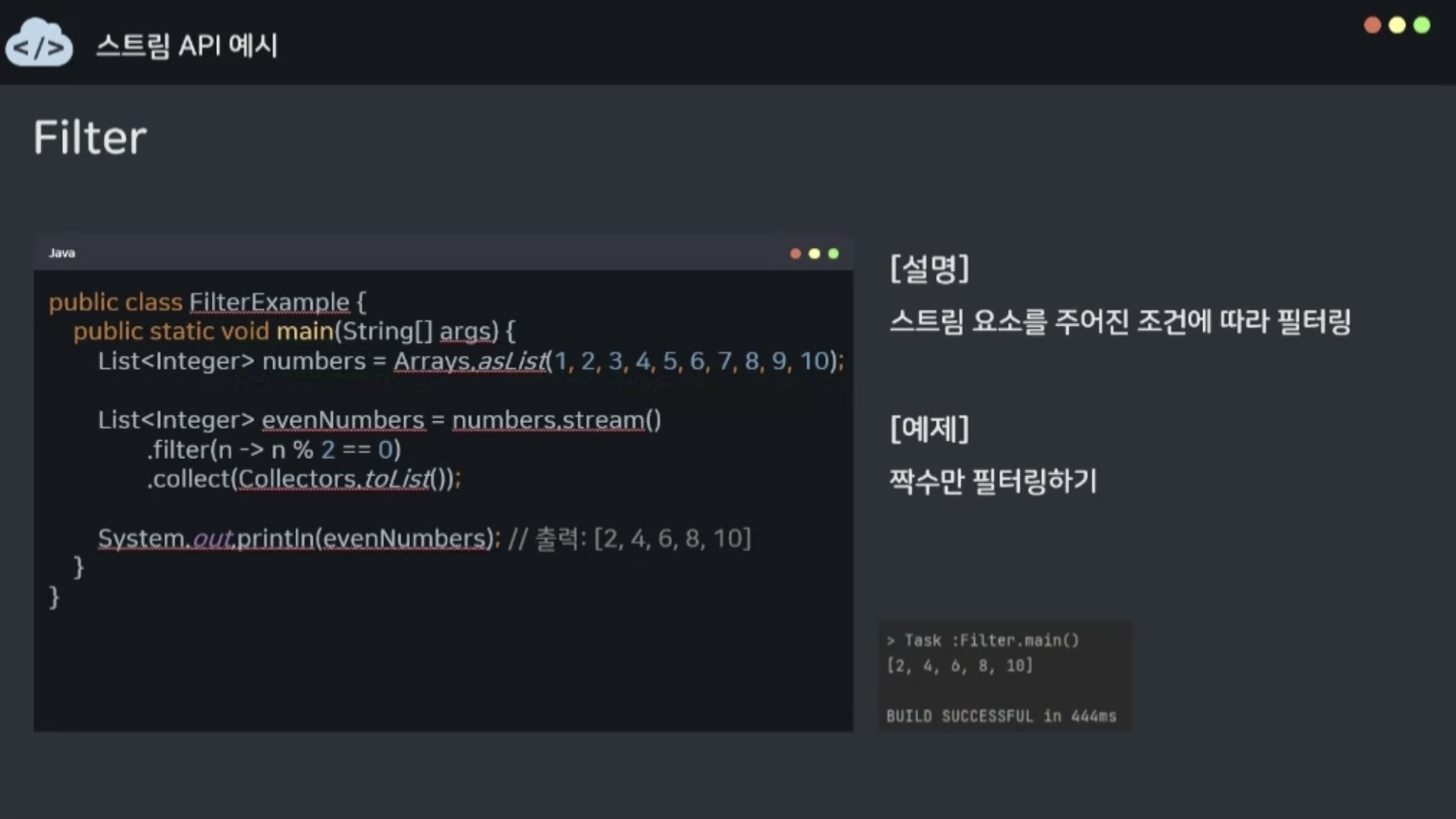 - 스트림 요소를 주어진 조건에 따라 필터링