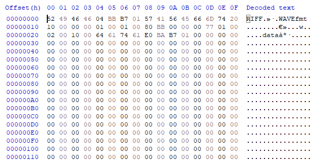 HxD를 사용하여 wav 파일의 정보를 나타낸 그림이다. 여기서 HxD는 hex, 16진수를 의미하는 것으로, 16진수로 이루어진 컴퓨터 표현을 읽는다는 뜻으로 쓴 것 같다. Decoded text을 보면 RIFF로 시작하여 WAVEfmt 웨이브 포맷이라는 것을 알려주고 있다. 그리고 더 뒤에 나오는 data 문자 이후부터는 진짜 pcm 정보, 바디 정보가 된다. 그 전까지는 헤더 정보이고.