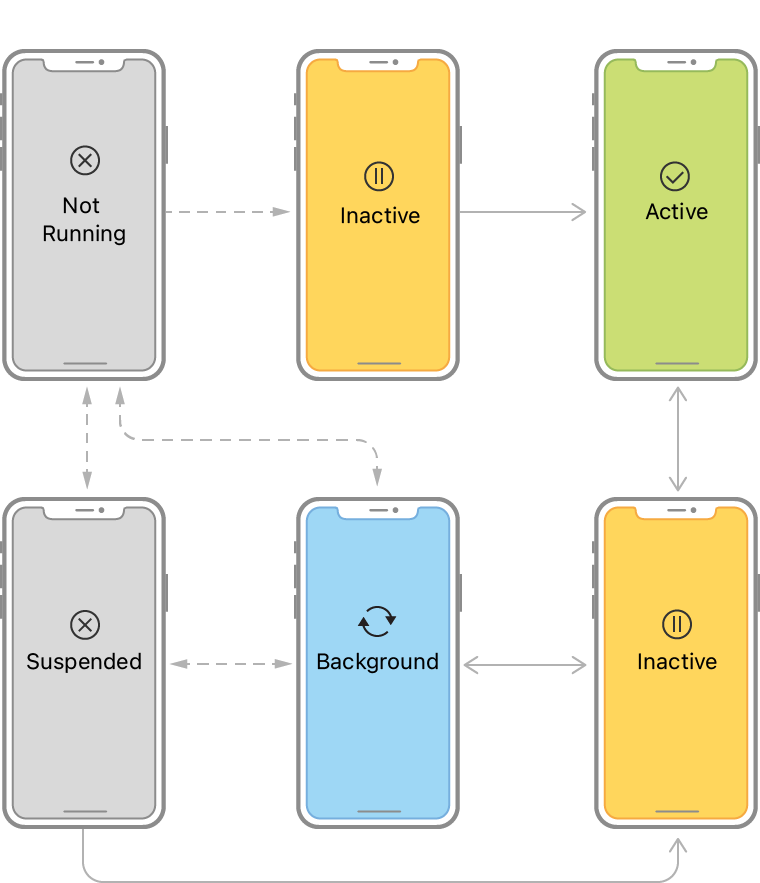 iOS 앱의 생명주기를 잘 나타내는 이미지입니다. 차례대로 살펴볼까요?