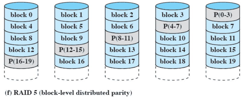 - 하나의 디스크에다가 parity 코드를 저장하는 것이 아니라 나눈다.