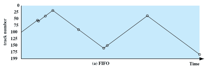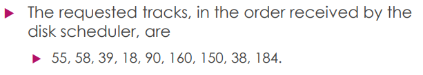 Disk Queue에 있는 Request는 위와 같이 서있다. 숫자는 Track 번호를 뜻한다. 숫자에 해당하는 Track에 있는 데이터를 읽으려고 할 때, 어떤 Track에 있는 Request를 먼저 읽을지 결정하는 것이 Disk Scheduling 이다.