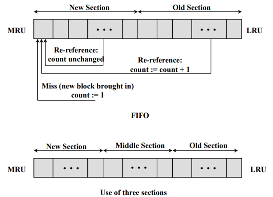 위 쪽의 그림은 문제가 있다. Old Section에 한번도 안간 Block이 New→Old로 간 직후에서 count = 0이기 때문에 버려질 수 있다. 따라서 아래쪽처럼 Section을 3개로 나눠서 사용할 수 있다.