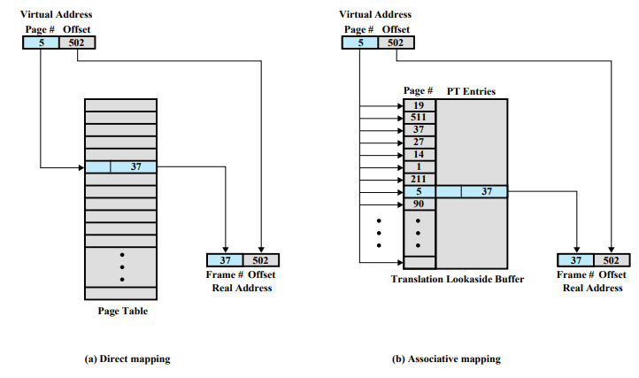 일반적인 페이지 테이블의 경우 인덱스로 찾아간다. 그런데 TLB는 associative mapping을 사용하는데 찾으려고 하는 데이터가 아예 원소안에 들어있다. 그래서 한꺼번에 내용을 비교한다.