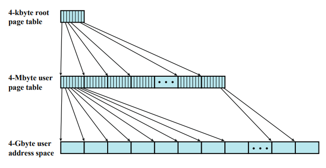 root page table 에는 페이지 테이블에 대한 정보가 있다. 각각의 페이지 테이블에 가면 실제 프로그램의 각 페이지에 대한 정보가 있다.