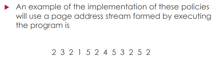 Paging System으로 Virtual Memory를 구현했는데, 한 프로세스당 3 페이지만 메모리에 있을 수 있다면, 3 페이지를 놓고 실행을 하다가 메모리에 없는 페이지가 필요하다면 현재 메모리에 있는 페이지 중에서 하나를 버려야 한다.