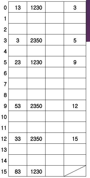 위의 페이지 번호 % 10 하면 3으로 같다. hash function을 적용시켰을 때 %10 한 나머지가 3인 페이지들의 첫번째 출발점은 인덱스 0이다. 그 다음은 인덱스 3이다. 오른쪽 끝의 값이 다음 인덱스를 가리키고 있다.