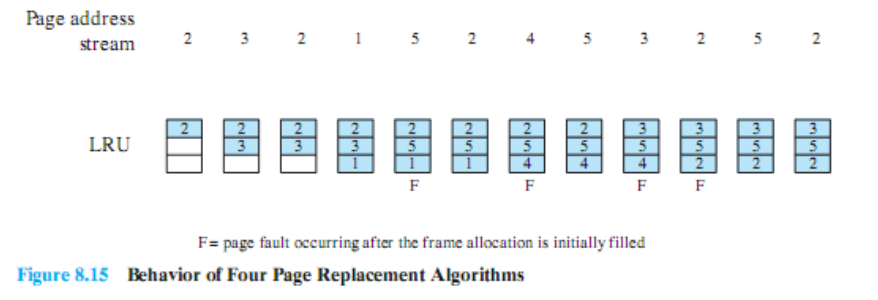 그 다음 4번 페이지를 가져오기 위해서 버릴 페이지를 찾는다. 4-5-3-2 순서로 사용되는데 2번을 제일 나중에 사용하기 때문에 2번 페이지를 버리고 4번 페이지를 가져온다. 이때 page fault가 발생한다.