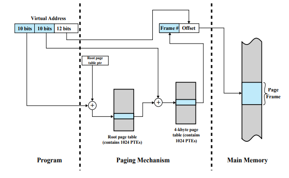 해당 부분이 내가 원하는 페이지 테이블의 시작주소이다. 그 후 Virtual Address의 두번째 페이지 테이블에서 몇번째 entry인지 번호를 더하면 그 페이지 테이블 안에서 해당하는 데이터가 들어있는 프레임 정보의 엔트리의 주소가 계산이 된다. 그 프레임 정보를 가져다가 오프셋을 붙이면 내가 원하는 데이터의 주소가 된다.