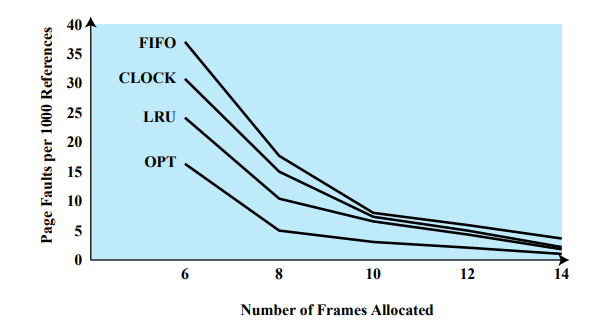 Clock 기법은 프레임 숫자가 10개가 되기 전까지는 LRU와 FIFO의 중간 정도이지만, 10개가 넘어가면 거의 LRU와 비슷하게 좋다.