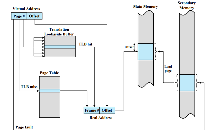 Virtual Address의 페이지 번호가 주어지면 TLB를 찾아본다. TLB에 원하는 정보가 있으면(TLB hit) 프레임 번호를 붙인다. 만약 TLB에 없으면(TLB miss) 페이지 테이블을 찾는다. 찾은 정보로 주소를 만들고, 테이블을 TLB에 옮겨놓는다. 페이지 테이블까지 가봤는데 없으면(page fault) 하드 디스크까지 가서 원하는 페이지를 가지고 와야 한다.