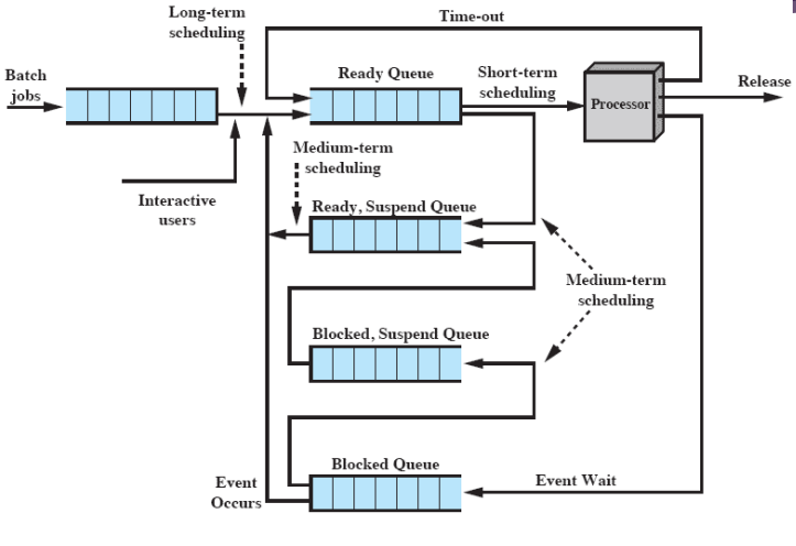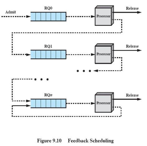 제일 처음에 도착한 프로세스는 0번 레디 큐로 들어간다. 그 후 스케쥴링되면 CPU를 차지한다. Block이나 Terminate 되면 그냥 나가면 되지만, 타임아웃이 되면 0번 큐로 들어가는 것이 아니라 1번 레디 큐로 들어간다.