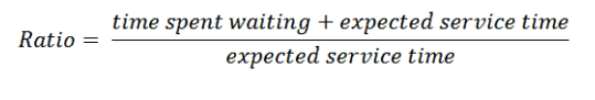 Ratio 가 높을수록 우선순위가 높아야 한다. service time이 작으면 Ratio 는 커진다. 따라서 Ratio 가 큰 프로세스가 우선순위가 높다.