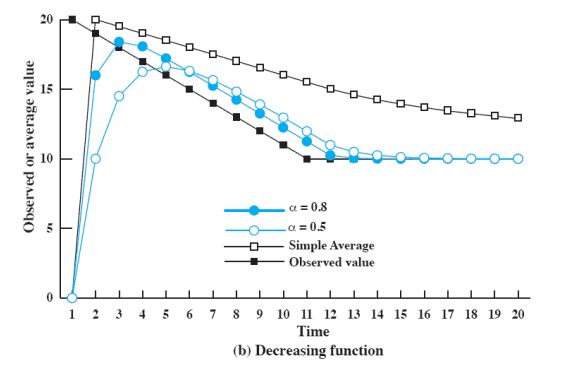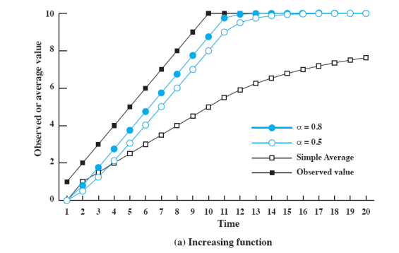 산술평균으로 예측한 경우 실제 상황과 많이 동떨어진다. 반면 Exponential Averaging을 사용하게 되면 실행시간 예측이 잘 들어맞는다.