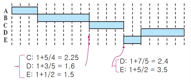 Ratio를 계산했을 때 D가 E 보다 0.1 더 높다. 그리고 이후에 12시에 고민 없이 D를 실행시키는 실수를 하지 말자. 같은 3시간이지만 각자의 실행시간에 따라 영향을 주는 정도가 다르다.