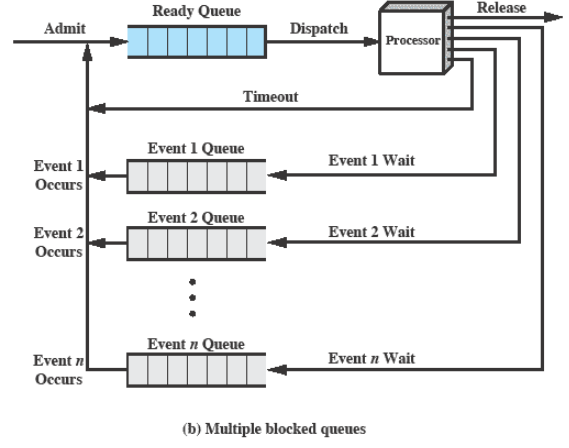 DIspathcer는 다음에 실행할 프로세스를 골라야 한다. Ready상태에 있는 프로세스를 골라야 한다. os는 Ready상태의 프로세스와 Blocked 상태의 프로세스를 분리시킨다. 따로 큐에 저장을 해둔다. 그래야 Dispatcher가 다음 프로그램을 고를때 Ready 상태에 있는 프로세스를 고를 수 있다.