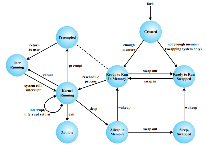 - ready to run swapped : swapping area에 있다가 IO가 끝났을 때