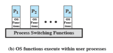 - Execution WIthin User Processes 방식 사용 = OS 코드에 아주 많은 부분을 유저 프로세스 안에서 실행